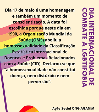 Esta data é uma oportunidade para a organização de atividades que promovam e apoiem a igualdade de direitos dos homossexuais e da comunidade LGBT. A ONG AGANIM DIREITOS HUMANOS fará na praça Elizabeth Paixão intervenção com folders de conscientização, chaveiros coma data e o nome do evento. A madrinha do evento Zezé Motta manda vídeo falando sobre o evento. dorj.com.br