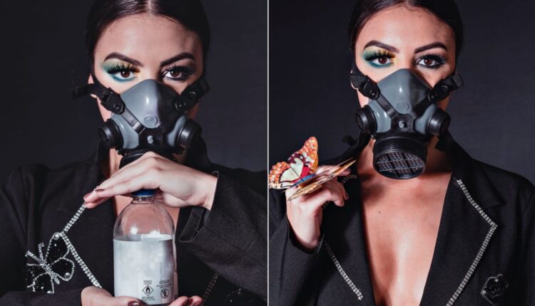 Nas fotos, a modelo evidencia o uso da máscara de proteção contra a COVID-19, filtrando vírus, protegendo a saúde e o respeito com os próximos. De suas atitudes nascem borboletas como símbolo de renovação e liberdade.